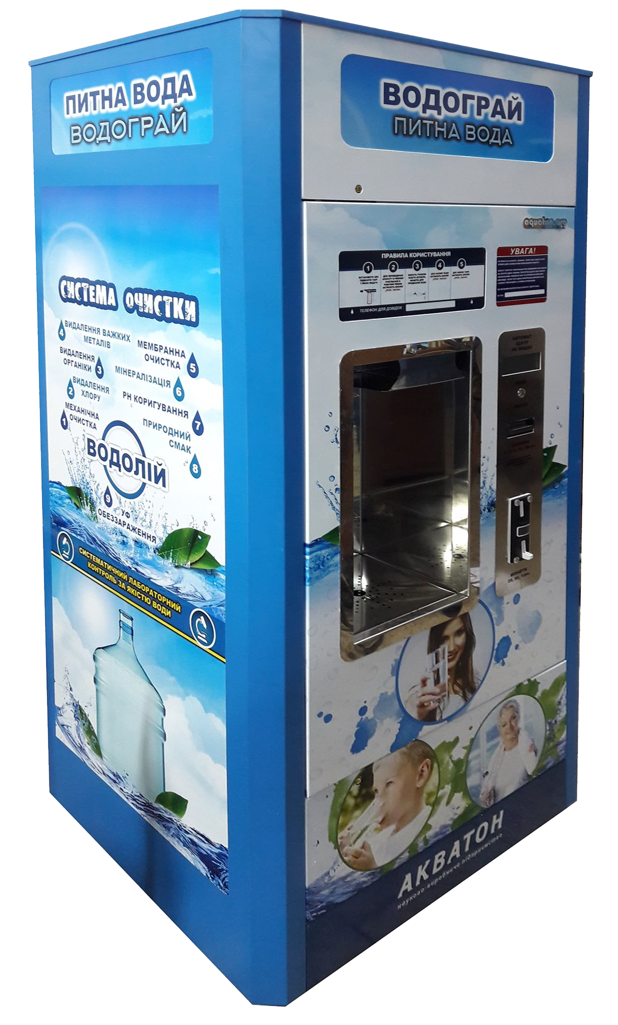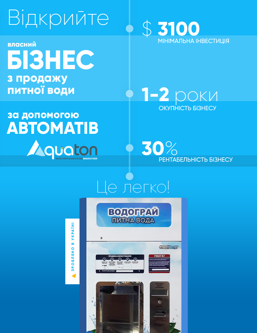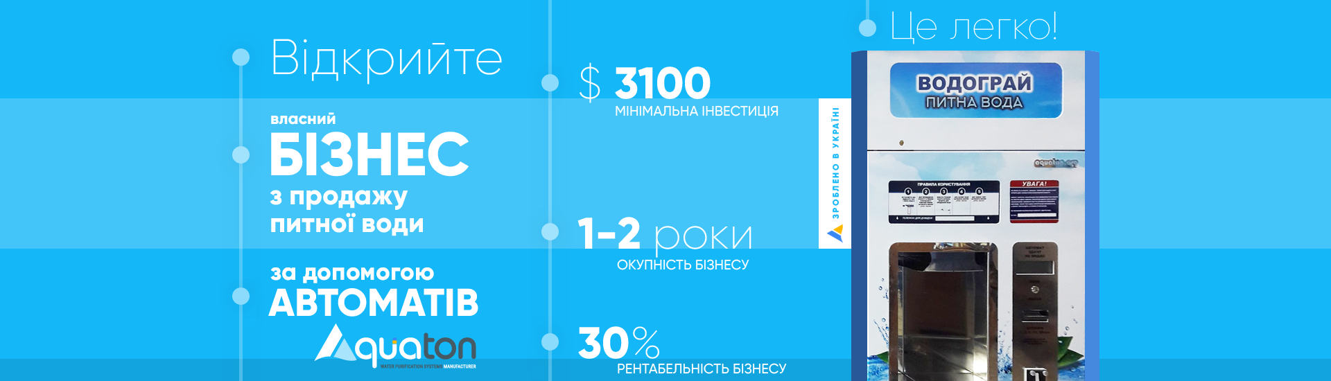 Ми пропонуємо Вам реалізувати ідею для малого бізнесу з продажу питної води, яка не тільки прибуткова, але і корисна суспільству. Автомати «Акватон» — це готовий бізнес під ключ зі стабільним доходом. Так як вода, друга, за потребою складова для життя людини, після повітря, і потреба в ній з кожним днем збільшується, то і попит на бізнес з продажу води постійно зростатиме.
